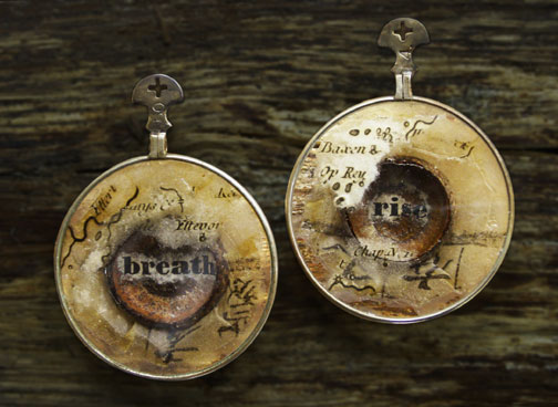 Optometrists' test lenses, acorn shells, maps, korean paper, text.