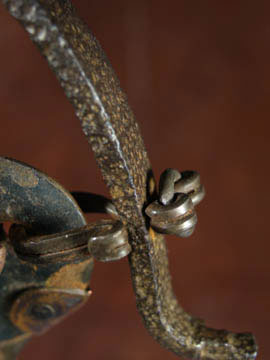 THE IMPROVISATRICE. 2000 Suitcase buckle, raccoon trap part, iron wire, copper, book leather, lens, hairspring, paua shell, upholstery tacks, pocket watch winding crown, brass stampings, catr-de-visite photographs, steel engraving, leather, paper, text, soil. Click image to view detail |