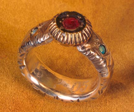 Sterling silver, garnet, opals, epoxy resin, gold watch winding crown.