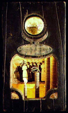 THE MARTYRS OF THE MIND. Wooden box, glass, lens, wood, masonite, gold-leaf, costume