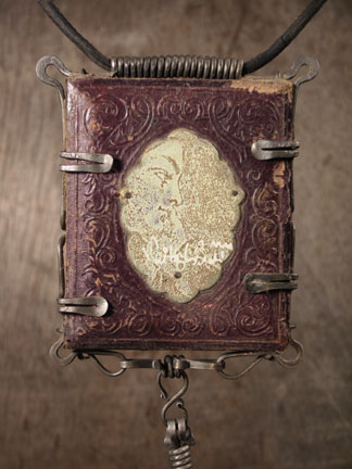Daguerreotype case, optician's test lens, brass ornament, eucalyptus nut, bead, crushed glass, 16th-century paper, key, brass, iron wire, leather, paper, text, soil.