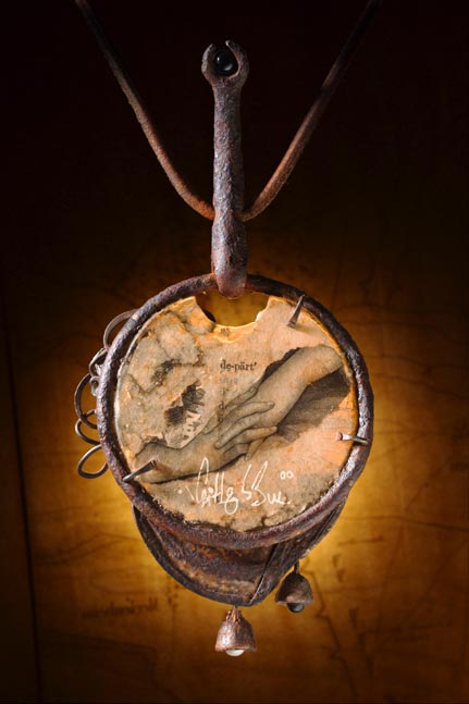 lever, gum nuts, glass, steel engravings, map, beads, scissor handles, leather,