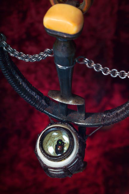 Victorian carving fork, steel animal trap jaw, unearthed clay pipe, waxed linen thread, fork tines, shoe tap, camera lens, beetle specimen, polyester resin, hardwood rings, steel, leather, soil.