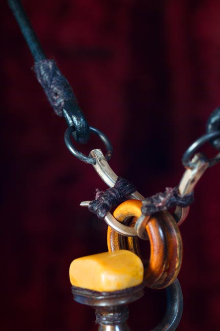Victorian carving fork, steel animal trap jaw, unearthed clay pipe, waxed linen thread, fork tines, shoe tap, camera lens, beetle specimen, polyester resin, hardwood rings, steel, leather, soil.
