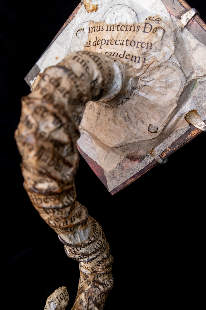 Victorian ‘pyralin-ivory’ hand mirror, steel scissors, antique bronze latch and unearthed brass fragment, 17th-century Czech glass bead, 19th-century wooden harmonium stop knob, sea urchin spines, raw apatite, 19th-century engravings, 18th-century book cover, crab claw, costume jewelry earring, acorn cap, Czech crystal, lenses, 17th-19th-century papers, steel wire, waxed linen thread, paper, text, soil.