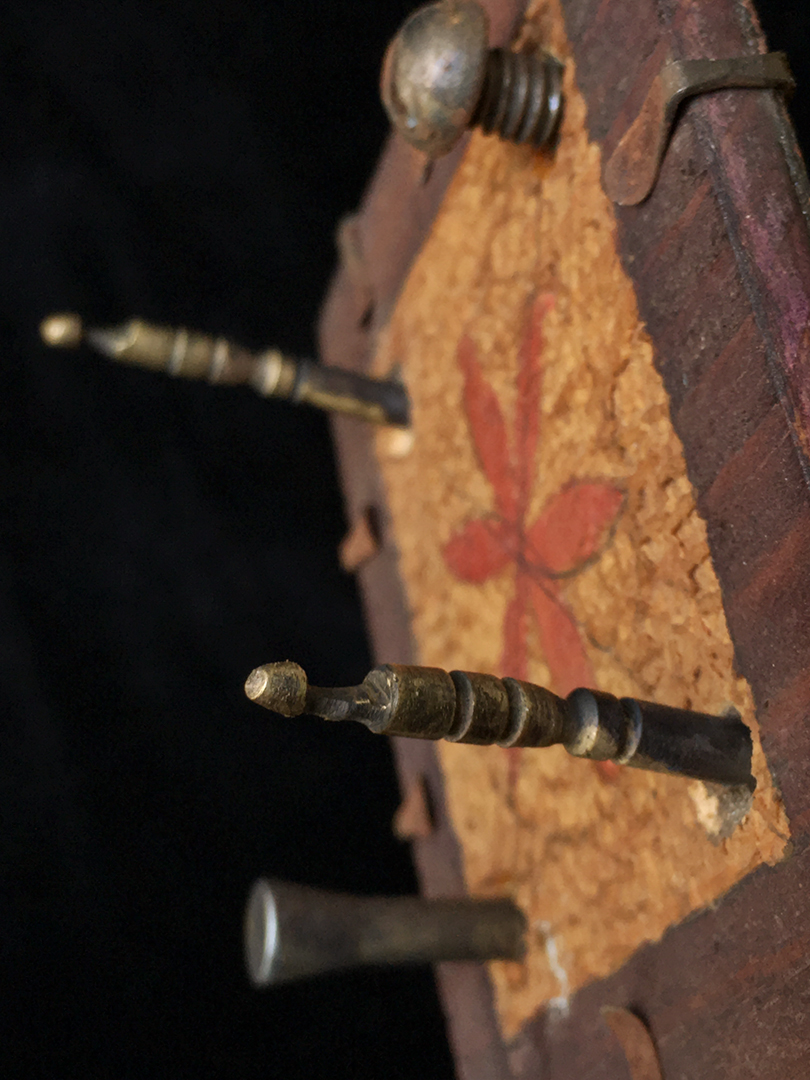 carved coaster, antique hardware, steel wire, steel tacks, 17th/19th-century paper, soil.