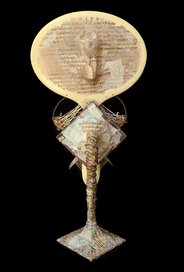 Victorian ‘pyralin-ivory’ hand mirror, steel scissors, antique bronze latch and unearthed brass fragment, 17th-century Czech glass bead, 19th-century wooden harmonium stop knob, sea urchin spines, raw apatite, 19th-century engravings, 18th-century book cover, crab claw, costume jewelry earring, acorn cap, Czech crystal, lenses, 17th-19th-century papers, steel wire, waxed linen thread, paper, text, soil.