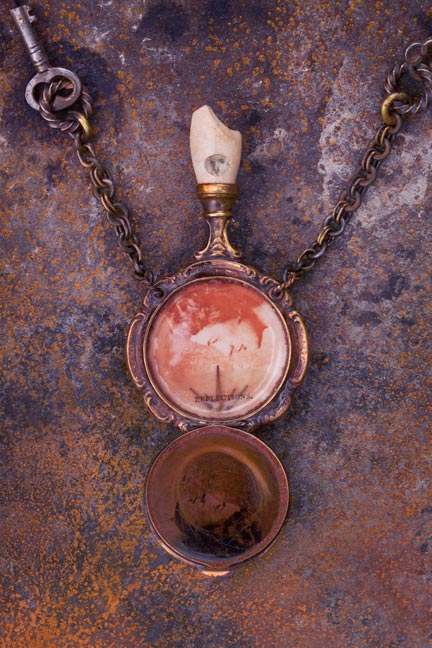 Vintage ladies' compact case, resins, Victorian clay pipe, labradorite, beetle specimen, early 19th-century map, ruby, sea urchin spines, lock of Maureen Kistle's baby hair, velvet, photographs of Miss Australia 1955 (Maureen Kistle) fused to glass, 18th-century steel engraving, copper, sand, brass, steel, antique keys, leather, paper, text, pearls, soil.