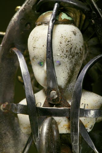 Serving spoon, porcelain doll bust, upholstery tack, brass drawer plate,