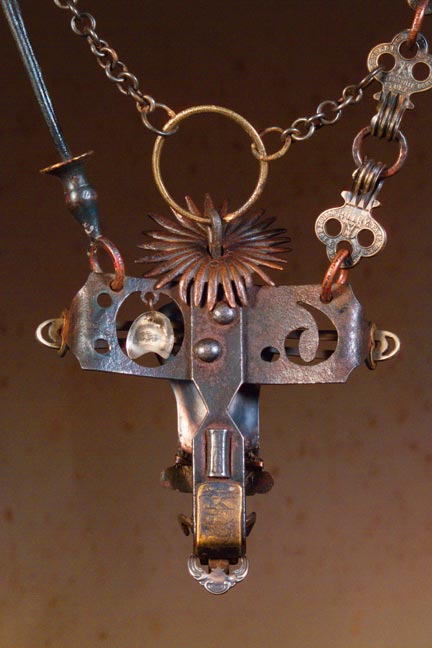 Neckpiece: Pendant: Steel animal leg trap, medieval spur, Victorian spoon and fork, porcupine quills, Roman horse boss, dichroic marble, copper, Victorian keys and brass door latch, bronze artifacts, steel wire, brass, chandelier crystal, steel-point engravings, leather, soil. Collection of the Click image for detail views |