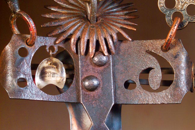 Steel animal leg trap, medieval spur, Victorian spoon and fork, porcupine quills, Roman horse boss, dichroic marble, copper, Victorian keys and brass door latch, bronze artifacts, steel wire, brass, chandelier crystal, steel-point engravings, leather, soil.