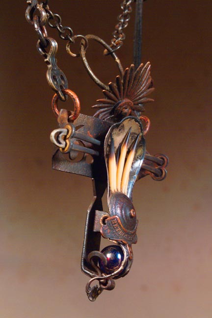 Neckpiece: Pendant: Steel animal leg trap, medieval spur, Victorian spoon and fork, porcupine quills, Roman horse boss, dichroic marble, copper, Victorian keys and brass door latch, bronze artifacts, steel wire, brass, chandelier crystal, steel-point engravings, leather, soil. Collection of the Click image for detail views |