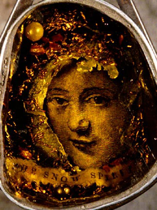 Calipers, asian bone game piece, glass vial, seeds, cat food can, copper, faux pearl, sterling silver, engravings, leather, paper, text, soil.