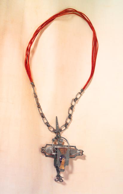 THE SOUL. Pendant (not including vertical piece where chain meets): Cord: 33" (83cm) Steel animal leg trap (with trip, chain and staking ring), Victorian forks, medieval horse boss fragment, brass balance cock with ruby, dichroic marble, brass, leather, steel wire. Click image to return |