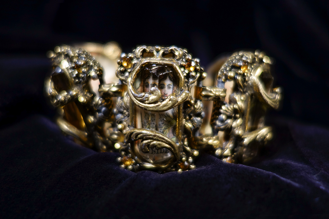 Bracelet: 7 1/8 x 1 1/2 x 5/8” (10.8 x 4 x 1.5cm) Vintage costume bracelet, early 18th-century French chandelier crystal, 1890s Royal Vienna painted porcelain plate fragments, 1746 music paper, 19th-century color lithographs, paper, text, soil. Click image to view detail |