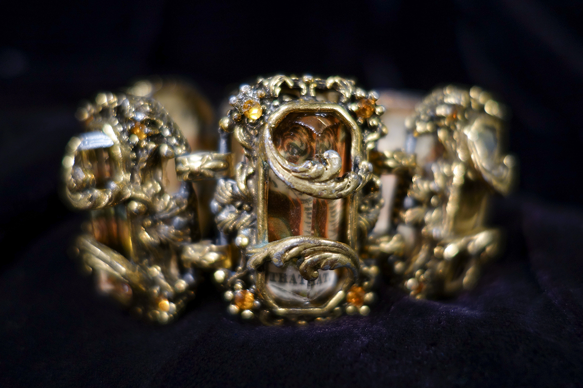 Bracelet: 7 1/8 x 1 1/2 x 5/8” (10.8 x 4 x 1.5cm) Vintage costume bracelet, early 18th-century French chandelier crystal, 1890s Royal Vienna painted porcelain plate fragments, 1746 music paper, 19th-century color lithographs, paper, text, soil. Click image to view detail |