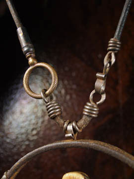 Scissors, raccoon leg trap, fork, grandfather clock hand (18th-century), opal, glass marble, upholstery tacks, linen thread, engraving, key, iron wire, brass, leather, soil. Click image to return