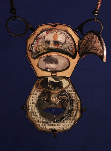 Ladies' compact, scissor parts, iron wire, mica, upholstery tacks, brass, engravings, maps, crushed glass, paper, leather, text, soil.